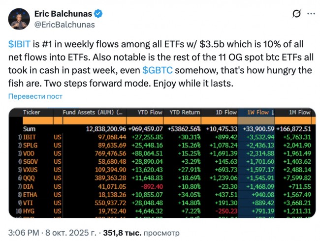Спотовый биржевой фонд (ETF) на базе биткоина IBIT компании BlackRock превысил 800 000 BTC ($97 млрд) в активах под управлением, менее чем через два года после начала торгов в январе 2024 года. По состоянию на 7 октября биткоин-ETF BlackRock накопил более 798 747 BTC. Последний, на момент публикации, чистый приток средств в IBIT составил $426,2 млн. (около 3510 BTC), что оказалось достаточным для преодоления рубежа, составив около 802 257 BTC или 3,8% от общего объема предложения биткоинов (21 млн). Для сравнения, это значительно опережает по объему активов BlackRock, принадлежащих клиентам, ведущую компанию по управлению биткоинами Strategy Майкла Сейлора, которая владеет 640 031 BTC стоимостью около $78 млрд, что составляет 3,1% от общего объема предложения. Согласно рыночным данным, семидневный положительный рост IBIT принёс более $4,1 млрд. чистого притока средств. «Восьмидневный приток средств в ETF подчёркивает устойчивый структурный спрос, в то время как участие корпоративных казначейств продолжает расширяться, усиливая позиции биткоина как стратегического резервного актива», - заявил руководитель исследований BRN Тимоти Мисир, добавляя: «Между тем, снижение геополитических рисков благодаря мирному соглашению на Ближнем Востоке, достигнутому при посредничестве Трампа, снизило краткосрочную волатильность, предоставив трейдерам более чёткие перспективы для перехода к четвёртому кварталу». ![]() «IBIT занимает первое место по еженедельным потокам среди всех ETF с объёмом в $3,5 млрд, что составляет 10% от всех чистых потоков в ETF», - отметил старший аналитик Bloomberg ETF Эрик Балчунас. В понедельник биткоин-ETF привлекли самый большой дневной приток средств с момента победы Трампа на президентских выборах в ноябре прошлого года - $1,21 млрд. С момента своего запуска американские спотовые биткоин-ETF зарегистрировали приток почти в $63 млрд, причём IBIT привлёк $65 млрд, а чистый отток средств из конвертированного фонда Grayscale компенсировал этот приток. ![]() «Обратите внимание на биткоин-ETF, которые сейчас на пике популярности… За последние 7 торговых дней они привлекли невероятные $5,3 млрд. А всего за последние два дня - $2 млрд. Помню, люди думали, что вся данные инвестиционные продукты достигнет максимума в $5 млрд», - добавил президент NovaDius Wealth Management Нейт Джерачи. Ранее, в декабре прошлого года, биткоин-ETF BlackRock превысил отметку в 500 000 BTC, быстро став третьим по величине биржевым фондом США всего за год своего существования. Хотите зарабатывать на крипте? Подписывайтесь на наши Telegram каналы! 0 комментов17 просмотров Читайте также