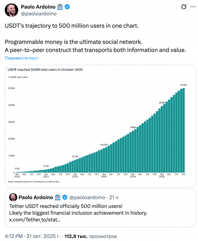 Привязанный к доллару стейблкоин USDT от Tether во вторник достиг своего 500-миллионного пользователя. «Вероятно, это крупнейшее достижение в области финансовой доступности в истории», - написал генеральный директор Tether Паоло Ардоино в посте на X. ![]() Tether заявил, что эта цифра представляет собой 500 миллионов «реальных людей», а не только кошельков, что позволяет предположить, что их стейблкоин в настоящее время используют около 6,25% населения мира. По оценкам Группы Всемирного банка, 1,4 миллиарда взрослых людей во всем мире не имеют доступа к банковским услугам. Криптовалюта - одно из возможных решений этой проблемы: любой, у кого есть телефон, может скачать криптокошелек для получения и безопасного хранения денег. Криптовалюта также может быть полезна для тех, кто живет в странах с высоким уровнем инфляции или в странах, где риск конфискации средств реален. В честь этого знаменательного события Tether выпустил 10-минутный документальный фильм, демонстрирующий принятие USDT в Кении, где люди обращаются к стейблкоинам «не для спекуляций, а для выживания». Ардоино отметил, что 37% пользователей USDT используют стейблкоин в качестве средства сбережения. Малые предприятия были вынуждены обращаться к USDT для оплаты импорта в качестве альтернативы слабеющему кенийскому шиллингу, что стало для этих компаний спасательным кругом, позволяющим удержаться на плаву. USDT - крупнейший стейблкоин на сегодняшний день с рыночной капитализацией в $182,4 млрд., что соответствует доле рынка в 58,4%. В прошлом месяце в сми сообщалось, что Tether ведет переговоры с инвесторами о привлечении до $20 млрд. при оценке около $500 млрд. , что сделает Tether одной из самых дорогих частных компаний в мире. Финансовая компания Cantor Fitzgerald выступает в качестве ведущего консультанта по потенциальной сделке. Хотите зарабатывать на крипте? Подписывайтесь на наши Telegram каналы! 0 комментов24 просмотра Читайте также