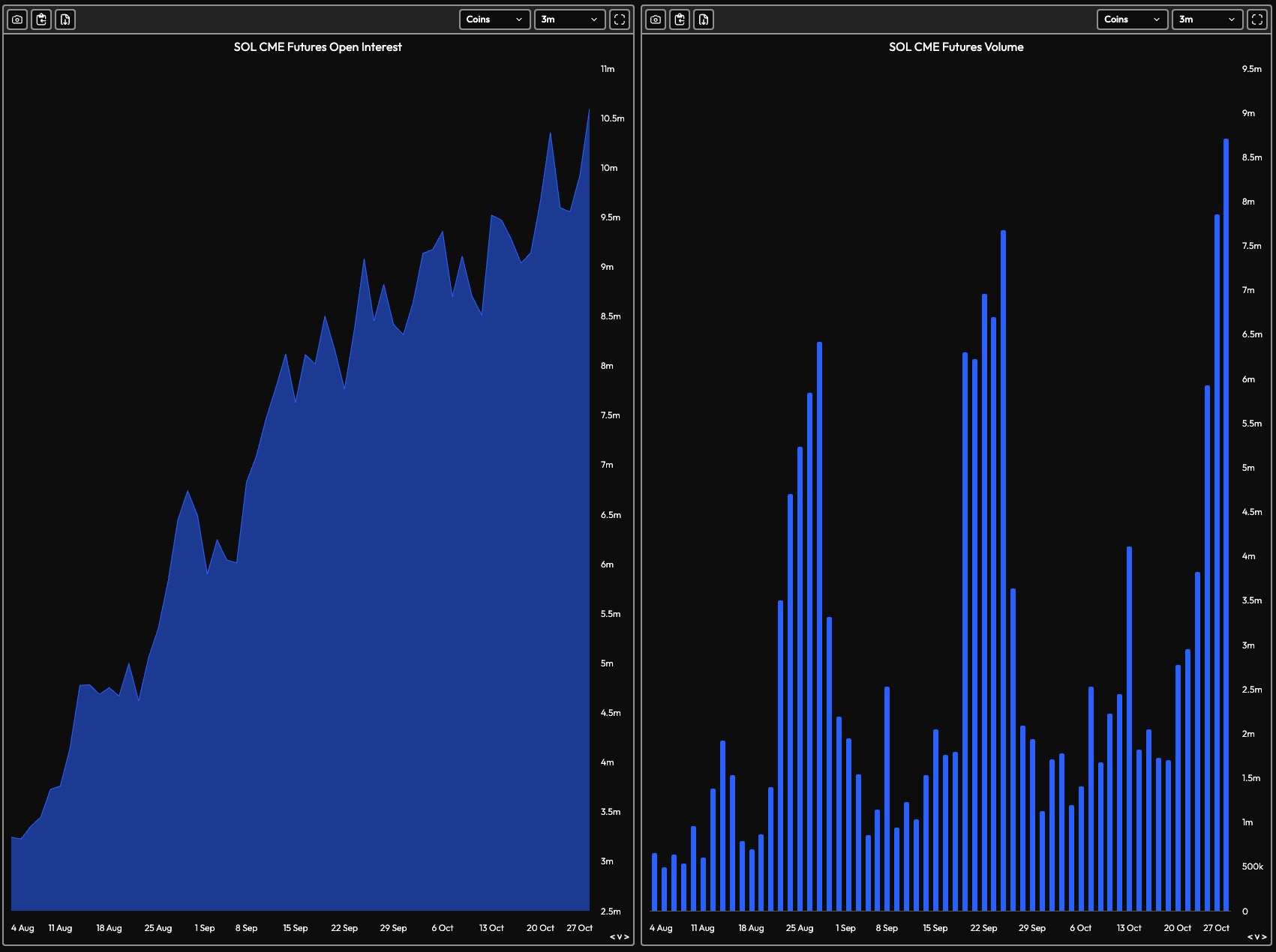 Трейдеры и аналитики настроены весьма оптимистично по отношению к SOL с начала осени, ссылаясь на установленный Комиссией по ценным бумагам и биржам США срок 10 октября для одобрения части спотовых ETF и на выдающиеся результаты BTC- и ETH- ETF в качестве тезиса для позиционирования в преддверии этого события. В то время данные показывали, что различные группы инвесторов вкладывались во фьючерсы и спотовые активы SOL, но шатдаун США поставило сроки под сомнение, а резкая ликвидация всего рынка криптовалют 10 октября привела к тому, что цена альткоина на некоторых криптобиржах упала до 147$.  Открытый интерес и объём фьючерсов SOL на CME за 3 месяца. Источник: Velo.xyz. На этой неделе на рынке начали торговаться первые два ETF на Solana. Grayscale Investments запустила свой спотовый Solana-ETF (GSOL) с поддержкой стейкинга в среду, а во вторник был запущен Bitwise Solana Staking ETF (BSOL).BSOL начал торги с активами в размере $222 млн. и завершил второй день торгов с объёмом торгов в $72 млн. До приостановки работы правительства США и распродажи 10 октября аналитики предсказывали, что одобрение Solana ETF и его успешный запуск дадут толчок росту цены SOL до диапазона от 300 до 600 долларов, однако в настоящее время альткоин торгуется около 200$. Поясняя ситуацию и о том, стала ли торговля SOL проявлением «продажи новостей», аналитики Hyblock заявили: «Запуск ETF на BTC и цена BTC также имели схожую взаимосвязь при запуске. Цена BTC оставалась стабильной и снижалась (около -5%), несмотря на растущий приток средств. В конце концов, поток средств открылся, и приток средств резко подскочил, что ознаменовало дно цены BTC. ETF SOL, возможно, переживает аналогичный цикл по мере того, как первоначальный ажиотаж утихает». Аналитики добавили, что «выбор времени для заседания FOMC на этой неделе неудобен, поскольку многие участники (особенно институты, которые покупали бы актив через ETF), вероятно, снижают риски в преддверии заседания. Это не рассматривается как тревожный сигнал; это ожидаемое поведение для таких резонансных событий». Текущие данные показывают, что продавцы доминируют в ценовой динамике SOL, при этом книга ордеров биржи Binance выделяет поддержку на уровне 188$ - 185$ и сопротивление на уровнях 204$ и 207$. Хотите зарабатывать на крипте? Подписывайтесь на наши Telegram каналы! 0 комментов19 просмотровЧитайте также