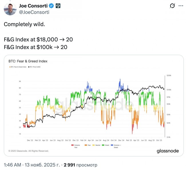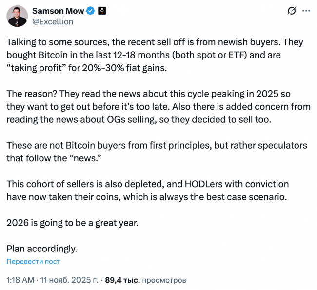Криптовалюты может ожидать «неожиданный рост в ноябре», поскольку последние индикаторы показывают, что трейдеры становятся все более настороженными, что обычно приводит к перемещению денег из слабых рук в долгосрочные накопители. Комментарии в социальных сетях о биткоине равномерно распределены между оптимистичными и пессимистичными , в то время как у эфира пессимистичных комментариев чуть более чем на 50% больше, чем пессимистичных. И тех, и других меньше, чем обычно, сообщает Santiment. В то же время менее половины комментариев в социальных сетях о XRP являются оптимистичными, что делает этот момент одним из самых «страшных моментов 2025 года» для токена. Настроения на рынке криптовалют остаются тревожными, поскольку рынок в целом продолжает падать. Аналитики связывают это с рядом макроэкономических факторов, таких как переход трейдеров на активы, более подверженные влиянию экономической политики и кредитных потоков, на фоне окончания приостановки работы правительства США. Индекс страха и жадности криптовалют, отслеживающий общие настроения рынка, сегодня составил 15 из 100 пунктов, что означает «чрезвычайный страх» - самый низкий рейтинг с марта. Джо Консорти, руководитель отдела роста биткоина в протоколе торговли и ликвидности Horizon, заявил, что общие настроения среди трейдеров находятся на том же уровне, что и в 2022 году, когда биткоин стоил около 18 000$, ссылаясь на данные Glassnode. ![]() Однако компания Santiment заявила, что ухудшение настроения трейдеров может стать «приятной новостью для терпеливых» и спровоцировать «неожиданный рост в ноябре», поскольку появится больше «бриллиантовых рук» (долгосрочных держателей), желающих схватить то, что продадут более «слабые руки». ![]() Настроения по поводу криптовалют в соцсетях заметно снизились. Источник: Santiment. «Когда толпа начинает негативно относиться к активам, особенно к криптовалютам с самой высокой рыночной капитализацией, это сигнал о том, что мы приближаемся к точке капитуляции. Как только розничные продажи идут на спад, ключевые игроки подхватывают упавшие монеты и взвинчивают цены. Вопрос не в том, случится ли это в следующий раз, а в том, когда это произойдёт». - сообщили в Santiment. Сэмсон Моу, основатель компании Jan3, занимающейся инфраструктурой биткоин-технологий, на прошлой неделе утверждавший, что рост курса биткоина еще не начался, во вторник поделился схожим мнением, заявив, что продают только «новые покупатели», а трейдеры с долгосрочными планами владения используют это как возможность накопить больше криптовалюты в свои кошельки. Моу утверждает, что давление со стороны продавцов исходит от людей, которые купили биткоин в последние 12-18 месяцев и фиксируют прибыль из-за опасений, что цикл достиг пика. ![]()