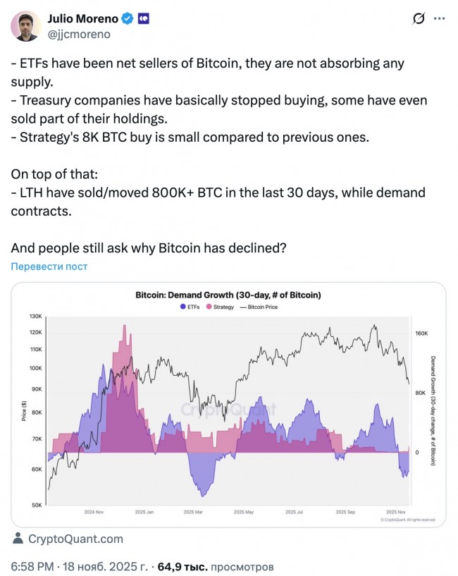 По данным аналитической платформы CryptoQuant, биткоин вступает в зону медвежьего тренда, поскольку институциональный спрос падает, а ключевые рыночные индикаторы указывают на нисходящую фазу. В своем последнем еженедельном отчете по криптовалютам, аналитики CryptoQuant сообщили, что условия на рынке биткоинов стали «самыми медвежьими» в текущем бычьем цикле, который начался в январе 2023 года. Индекс бычьего рейтинга CryptoQuant снизился до экстремально медвежьих уровней 20/100, в то время как цена BTC упала намного ниже 365-дневной скользящей средней в 102 000$ - ключевого технического уровня и последнего медвежьего сигнала, знаменующего начало медвежьего рынка 2022 года. Падение цен происходит на фоне ослабления институционального спроса, включая сокращение покупок биткоин-казначейскими компаниями, такими как Strategy Майкла Сейлора, а также ограниченного притока средств в американские спотовые биткоин-ETF. Даже с учетом последней покупки Strategy в размере 8 178 BTC ($835 млн) - крупнейшего приобретения компании с июля 2025 года - эта покупка остается значительно меньше многих предыдущих крупных покупок, отметил руководитель исследований CryptoQuant Хулио Морено. «Казначейские компании практически прекратили покупки, некоторые даже продали часть своих активов», - заметил Морено, имея в виду такие компании, как Metaplanet, чья последняя покупка BTC была в сентябре. ![]() Помимо снижения корпоративных покупок, давление также испытывают биткоин-ETF: по данным CoinShares, с начала года приток средств сократился до $27,4 млрд, что на 52% ниже прошлогоднего показателя в $41,7 млрд. Говоря о ключевых факторах, способствовавших росту рынка в прошлом, CryptoQuant упомянул победу Дональда Трампа на президентских выборах 2024 года, в результате которой к началу декабря стоимость биткоина впервые превысила 100 000$. В августе 2025 года запуск нескольких компаний, выпускающих биткоин-казначейские облигации, поднял цену биткоина выше 120 000$. «Эти катализаторы теперь исчезли», - говорит аналитики, добавляя: «Что могло бы стать достаточно мощным катализатором, чтобы вновь увеличить спрос на биткоин в 2026 году? Серьёзные события, похоже, не предвидятся (стратегический резерв США по биткоину) или сильно недооцениваются рынком (дальнейшее снижение процентных ставок ФРС)». В CryptoQuant отметчают, что тенденция к снижению потенциально совпадает с четырехлетним циклом, повторяя предыдущие циклы, которые длились четыре года, включая 2014 - 2017 и 2018 - 2021 годы, добавив, что текущий цикл (2022 - 2025 г.г.) подходит к концу по этому критерию. «Означает ли это быстрый обвал цены биткоина? Нет. На данный момент биткоин потерял 28% и достиг важных уровней поддержки в 90 000$ - 92 000$. Даже на медвежьих рынках цены могут вырасти на 40 - 50% за несколько месяцев. Однако теперь, когда цена биткоина опустилась ниже 365-дневной скользящей средней, этот уровень становится сильным ценовым сопротивлением ($102,6 тыс.)». Хотите зарабатывать на крипте? Подписывайтесь на наши Telegram каналы! 0 комментов20 просмотров Читайте также