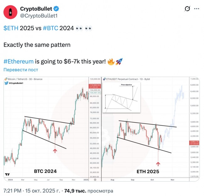Компания BitMine Immersion Technologies, возглавляемая Томом Ли, приобрела еще 104 336 ETH на сумму около $417 млн, согласно ончейн-данным. По данным Lookonchain, за последние сутки купленные активы с бирж поступили на три новых кошелька, ассоциируемые аналитиками с BitMine. «Несмотря на обвал рынка криптовалют, Том Ли по-прежнему прогнозирует, что к концу года ETH достигнет 10 000$», — добавили в Lookonchain. Ранее на этой неделе Ли и соучредитель BitMEX Артур Хейс повторили свой прогноз о том, что в этом году цена эфира достигнет 10 000$. Аналитическая компания Arkham, специализирующаяся на блокчейн-технологиях, согласилась с выводами исследователей, заявив, что три новых кошелька-кита только что приобрели ETH на сумму $75 млн. каждый. «Темпы приобретения совпадают с тенденциями, характерными для BitMine», - заявили они. Ранее на этой неделе BitMine воспользовалась падением на фоне обвала криптовалютного рынка в минувшие выходные. В понедельник компания объявила, что приобрела 202 037 ETH «за последние несколько дней», воспользовавшись снижением цен. «Ликвидация криптовалют за последние несколько дней привела к снижению цены ETH, чем воспользовалась BitMine», - сказал тогда Том Ли. ![]() Транзакции Ethereum, связанные с BitMine. Источник: Arkham. Компании, занимающиеся цифровыми активами, такие как BitMine, похоже, не обеспокоены недавними потрясениями на рынке криптовалют и используют возможность покупать на просадке. Всего за несколько месяцев BitMine достигла 50% от своего целевого объема казначейства, накопив колоссальную сумму в 3 миллиона ETH, что эквивалентно 2,5% от общего объема предложения. По данным StrategicEthReserve, активы компании также представляют собой половину эфира, накопленного всеми публичными корпоративными казначействами, который в настоящее время составляет 5,9 млн ETH на сумму $23,7 млрд. Однако Ли относится к числу многих экспертов и аналитиков, которые уверены, что эфир возобновит свой рост в течение следующих нескольких месяцев. «Ethereum копирует развитие BTC в 2020 - 2021 годах», - сказал аналитик «Rekt Fencer», добавив, что «цена ETH в 15 000$ все еще актуальна в этом цикле». Тем временем аналитик рынка «Crypto Bullet» сравнил графики биткоина в 2024 году и эфира в 2025 году, заявив, что они «действуют по той же схеме», и спрогнозировал рост ETH до 6000$ - 7000$ в этом году. ![]() Хотите зарабатывать на крипте? Подписывайтесь на наши Telegram каналы! 0 комментов20 просмотров Читайте также