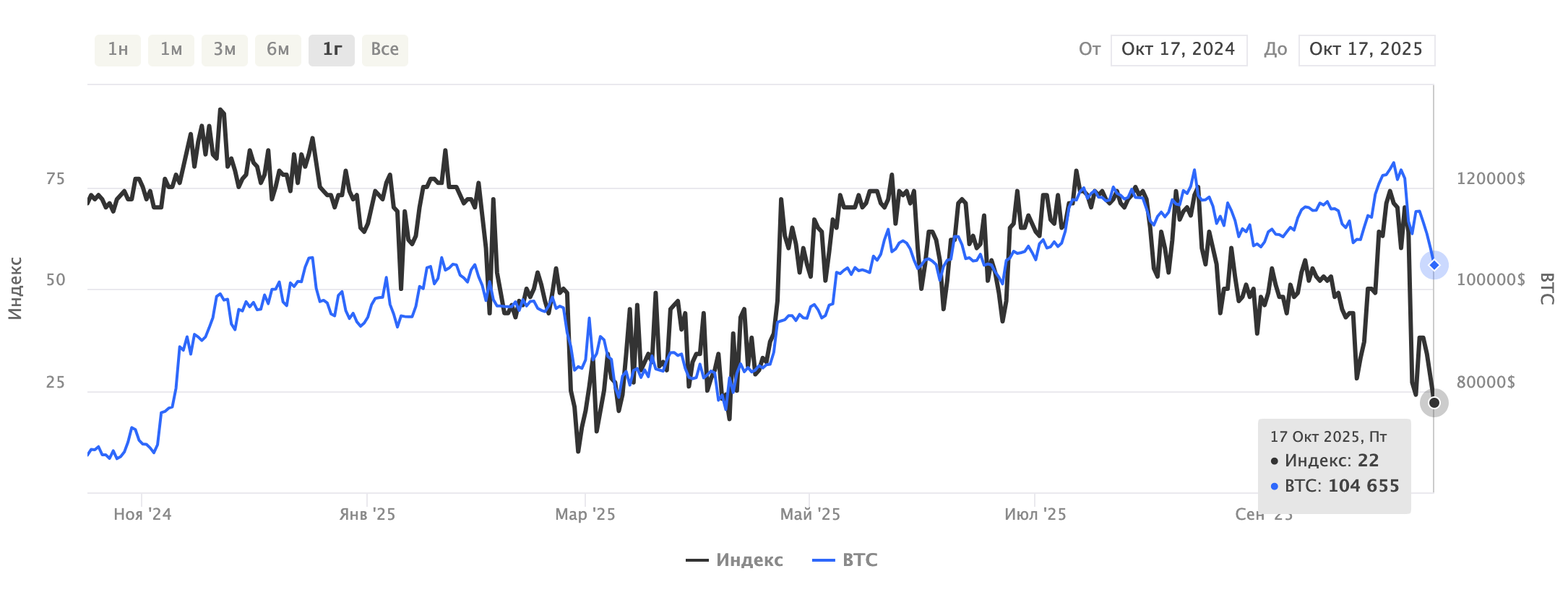 На этой неделе индекс страха и жадности на криптовалютном рынке резко изменился в сторону «страха», упав до уровня, который в последний раз наблюдался в апреле, когда в результате распродажи рынка за один день было потеряно более $230 млрд. На момент публикации индекс страха и жадности, который отслеживает волатильность, динамику рынка, тенденции в социальных сетях и показатели доминирования, упал до минимума в 22 баллов, что соответствует зоне «чрезвычайный страх». Общая капитализация крипторынка упала примерно до $3,54 трлн, что на 6% меньше, чем $3,78 трлн. накануне. Это привело к потере более $230 млрд. в этом секторе, что стало одним из самых резких падений за один день за последние месяцы. Стоит отметить что, аналогичный индекс страха для традиционных активов также упал до столь же низкого уровня, что свидетельствует о сильном страхе и на более широких традиционных рынках. В четверг американские акции закрылись в минусе из-за потрясений на кредитном рынке, подверженности региональных банков риску невозвратных кредитов и торговой напряжённости между США и Китаем, что усилило беспокойство на Уолл-стрит и создало новое понижающее давление на криптоактивы. ![]() График индекса страха и жадности BTC. Согласно рыночным данным основные криптовалюты продолжили снижаться в цене за последние сутки на фоне углубления коррекции на рынке в целом. Биткоин упал почти более чем на 7% и потерял уровень в 105 000$, в то время как эфир упал почти на 8% и торгуется около 3 700$. Среди альткоинов с большой капитализацией BNB лидирует по убыткам с падением почти на 12%, за ним следует Chainlink с падением почти на 11% и Cardano, который упал почти на 10%. Солана и XRP также упал более чем на 8%, продолжив недельное снижение, которое свело на нет двузначный рост, достигнутый в начале этого месяца. В среднем за последние 24 часа стоимость крупнейших криптовалют, не относящихся к стейблкоинам, снизилась примерно на 8 - 10 %. ![]() Капитализация и объём рынка криптовалют. Источник: CoinMarketCap. В то время как обвал рынка на прошлой неделе привёл к ликвидации активов на сумму почти $20 млрд., на этой неделе активность была значительно ниже. Данные CoinGlass показали, что на биржах были ликвидированы позиции с кредитным плечом на сумму около $556 млн., что составляет лишь малую часть от показателя прошлой недели. Из этой суммы примерно $451 млн. было ликвидировано в длинных позиций, а $105 млн - шортовых ликвидаций. ![]() Общая сумма ликвидаций по биржам. Источник: CoinGlass. Помимо ведущих криптовалют, недавний обвал затронул и другие активы, такие как мемкоины, невзаимозаменяемые токены (NFT) и криптовалютные ETF. Мемкоины, которые продемонстрировали небольшие признаки восстановления на этой неделе, упали в цене на 33% за день, при этом объёмы торгов оставались относительно высокими и составили почти $10 млрд. Сектор NFT, который также восстановился после падения на $1,2 млрд. на прошлой неделе, растерял свои достижения и опустился ниже отметки в $5 млрд, которую в последний раз видели в июле. Между тем спотовые биткоин- и эфирные ETF также отреагировали на обвал. В четверг спотовые биткоин-ETF зафиксировали отток средств на сумму более $536 млн., а спотовые ETH-Р-ETF продемонстрировали ежедневный чистый отток средств на сумму более $56 млн. Хотите зарабатывать на крипте? Подписывайтесь на наши Telegram каналы! 0 комментов93 просмотра Читайте так