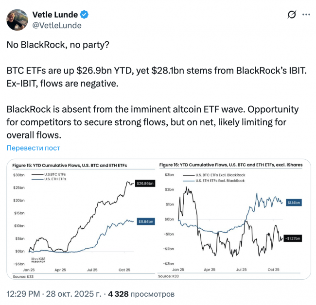 Согласно рыночным данным, долгожданное одобрение биржевых инвестиционных фондов (ETF) на основе альткоинов может не принести того огромного притока средств, которого ожидают инвесторы, без участия гиганта по управлению активами BlackRock. Фонд iShares Bitcoin Trust ETF компании BlackRock получил инвестиции в размере $28,1 млрд. в 2025 году, став единственным фондом с положительным притоком средств с начала года (YTD), в результате чего общий приток средств в спотовые Bitcoin ETF достиг совокупного показателя в $26,9 млрд. По словам Ветле Лунде, руководителя исследований компании K33, без учета фонда BlackRock спотовые биткоин-ETF зафиксировали совокупный чистый отток в размере $1,27 млрд. с начала года. Приток средств из спотовых биткоин-ETF стал основным драйвером роста цены биткоина в 2025 году, как недавно сообщил руководитель отдела исследований цифровых активов компании Standard Chartered Джефф Кендрик. BlackRock - крупнейшая в мире компания по управлению активами: по состоянию на третий квартал 2025 года объем активов под ее управлением составил $13,5 трлн. По словам Лунде, исходя из динамики инвестиций в биткоин-ETF, отсутствие BlackRock в волне альткоин-ETF может ограничить общий приток средств и его потенциальное положительное влияние на базовые криптовалюты. ![]()