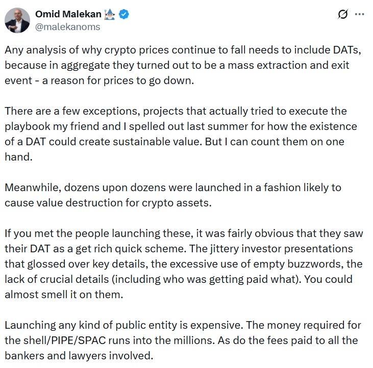 Омид Малекан, автор книг о блокчейне и профессор Школы бизнеса Колумбийского университета, утверждает, что разговоры о падении цены биткоина должны включать в себя влияние компаний, занимающихся криптофинансированием, которые способствовали этому снижению. «Любой анализ причин, по которым цены на криптовалюты продолжают падать, должен включать DAT [Digital Asset Treasury, компании по управлению цифровыми активами]», - написал Малекан, добавляя: «В совокупности это оказалось событием массового изъятия и выхода - причиной снижения цен». Он добавил, что есть несколько компаний, которые пытались «создать устойчивую ценность. Но я могу пересчитать их по пальцам одной руки». Аналитики связывают падение рынка криптовалют с торговой напряженностью между США и Китаем, а также с другими макроэкономическими факторами. В результате биткоин за последние семь дней колебался от 99 607$ до 113 560$, упав с исторического максимума 6 октября, превысившего 126 000$. ![]() Многим компаниям, покупающим криптовалюту, удалось привлечь миллионы долларов от инвесторов, искавших возможности инвестировать в криптовалюту, и Малекан утверждает, что некоторые из людей, запускавших компании по управлению криптоактивами, рассматривали эту модель «как способ быстрого обогащения». «Создание любой публичной организации - дело дорогостоящее. Средства, необходимые для создания подставной компании/PIPE/SPAC, исчисляются миллионами. Как и гонорары всех банкиров и юристов, участвующих в этом процессе. Деньги, потраченные на эти сборы, нужно было откуда-то взять», - сказал он. Компании, занимающиеся управлением криптоактивами, приобретали значительные запасы токенов основных криптовалют, используя для этого кредитные плечи посредством продажи акций, конвертируемых облигаций и размещения долговых обязательств, что вызвало опасения, что компании, использующие заемные средства, могут усугубить спад рынка путем принудительной продажи (ликвидации) активов. Другие пытались привлечь инвесторов, генерируя доход от своих активов с помощью таких мер, как стейкинг, в то время как некоторые объявили о планах разместить часть своих активов в криптопротоколах для целей лендинга (кредитования) и обеспечения ликвидности. «Самый большой ущерб, который DAT нанесли совокупной капитализации рынка криптовалют, заключался в организации массового выхода из предположительно заблокированных токенов», - заявил Малекан. «Я до сих пор удивляюсь, как столько других инвесторов не возмутились этим». Он добавил, что «привлечение слишком большого количества средств и выпуск слишком большого количества токенов, даже если они заблокированы или предназначены для роста экосистемы, - это гангрена криптовалют». Количество крипто-казначейств в этом году резко возросло: в октябрьском отчете компании Bitwise зафиксировано 48 новых случаев добавления биткоинов на баланс компаний (всего их 207, на момент публикации), которые в совокупности владеют более чем миллионом токенов на сумму более $101 млрд. В то же время, по данным Strategic ETH Reserve, Эфир - вторая по популярности криптовалюта для корпоративных крипто-казначейских, была добавлена на балансы 70 компаний. В общей сложности компании владеют 6,14 млн ETH на сумму более $20 млрд. Аналитики прогнозируют, что DAT, вероятно, начнут консолидироваться под руководством нескольких крупных 